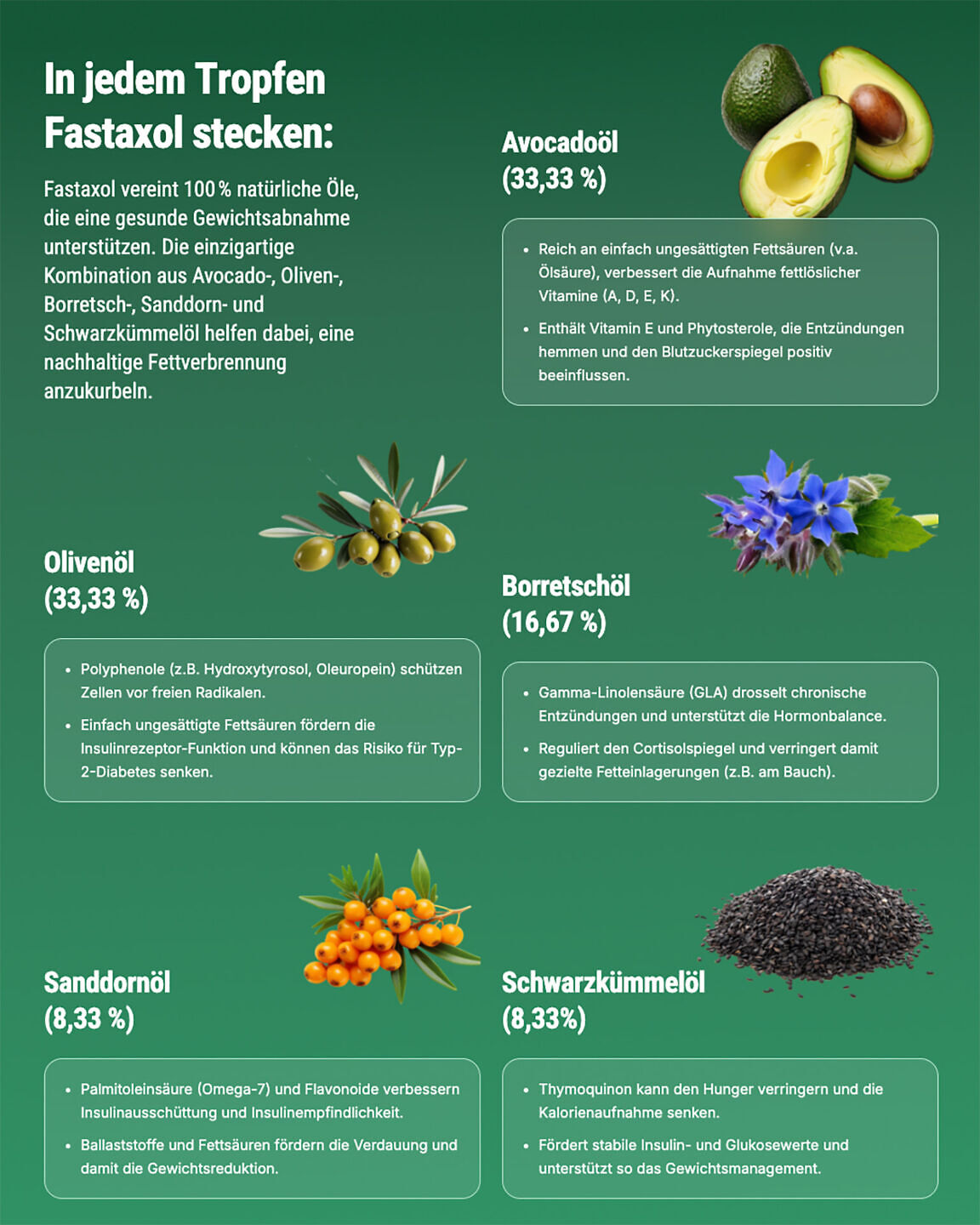 Die in „Fastaxol“ enthaltenen Pflanzenöle zielen darauf ab, zentrale Stoffwechselprozesse gezielt zu beeinflussen. Durch ihre spezielle Zusammensetzung senden sie biochemische Signale an den Körper, die denen des Fastens ähneln. So wird die Autophagie angeregt, ein natürlicher Reinigungsmechanismus, bei dem beschädigte Zellbestandteile abgebaut und erneuert werden. Gleichzeitig verbessern bestimmte Fettsäuren die Insulinempfindlichkeit, was hilft, Blutzuckerschwankungen zu reduzieren und Heißhunger zu vermeiden.